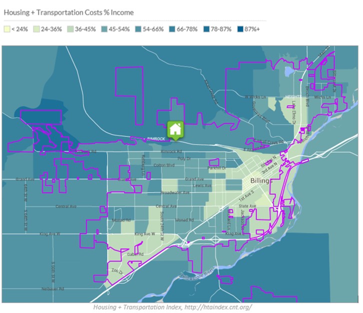 The Housing and Transportation Affordability Index is a tool allowing the evaluation of urban sustainability by providing a comprehensive view of affordability that combines both the cost of housing and transportation. The map below was downloaded in March 2015 and illustrates the combined cost of housing and transportation across Billings, Montana. A larger version of the map.-