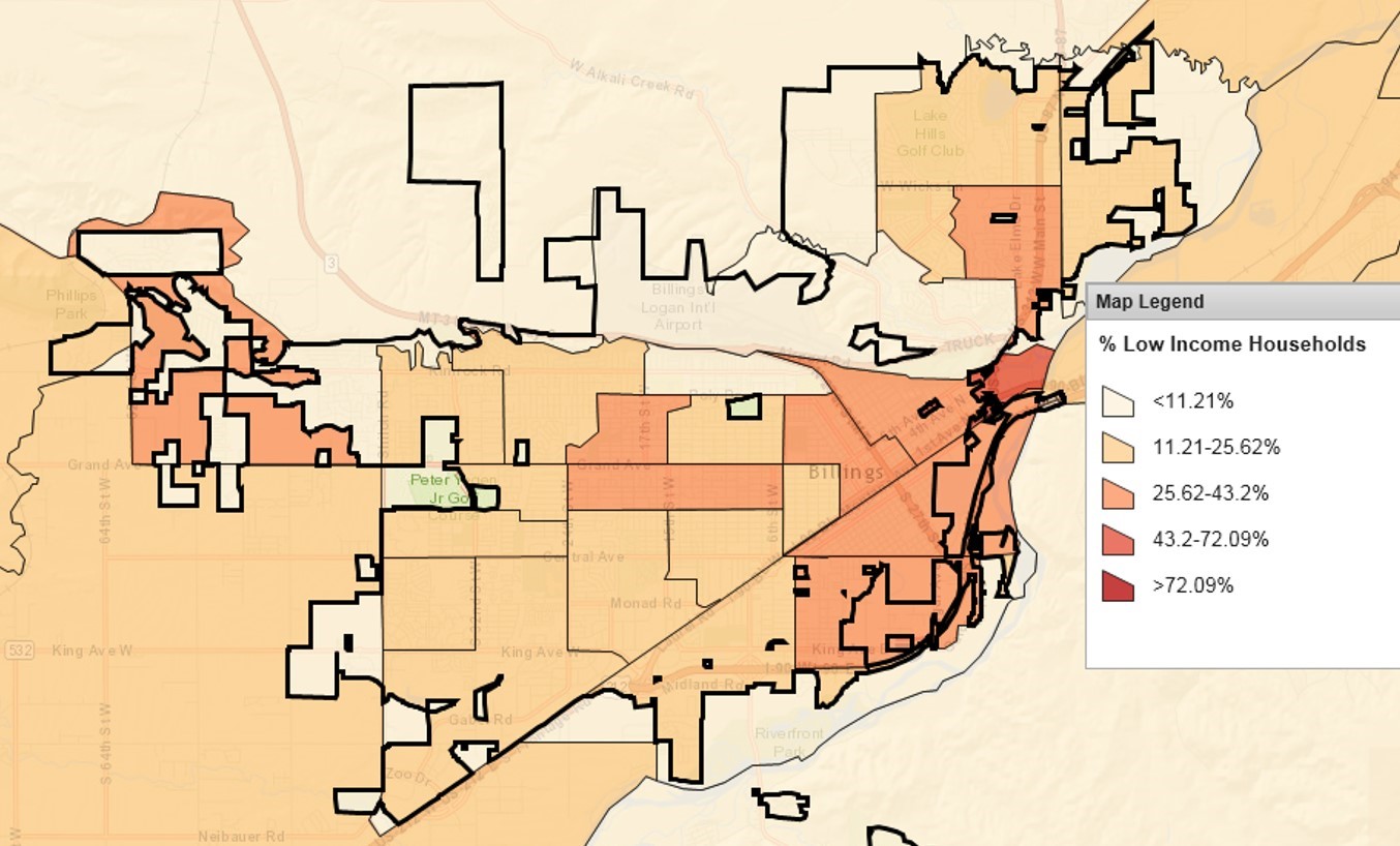 Examples of both the Economic Development and Housing Toolkits were downloaded in February 2016 for census tract 3.01. The map below was downloaded from CPD Maps in March 2015 and illustrates concentrations of low income households in Billings, Montana. A larger version of the map.