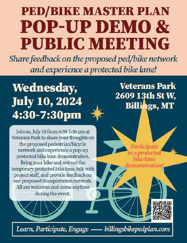 For those who are unable to attend the pop-up demonstration, public input can be provided on the proposed network at billingsbikepedplan.com between now and July 28, 2024. Billings-area residents are invited and encouraged to share their feedback about the proposed walking, biking, and rolling network via the interactive web map. The interactive web map allows participants to map potential connections and identify specific areas of concern and opportunity. Participants can see comments that other community members have noted.